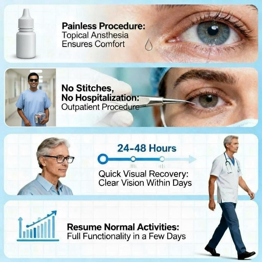 Most patients notice improved vision within 24–48 hours. Since it is a day-care procedure with no stitches or overnight stay, residents can return to their daily activities comfortably and safely.