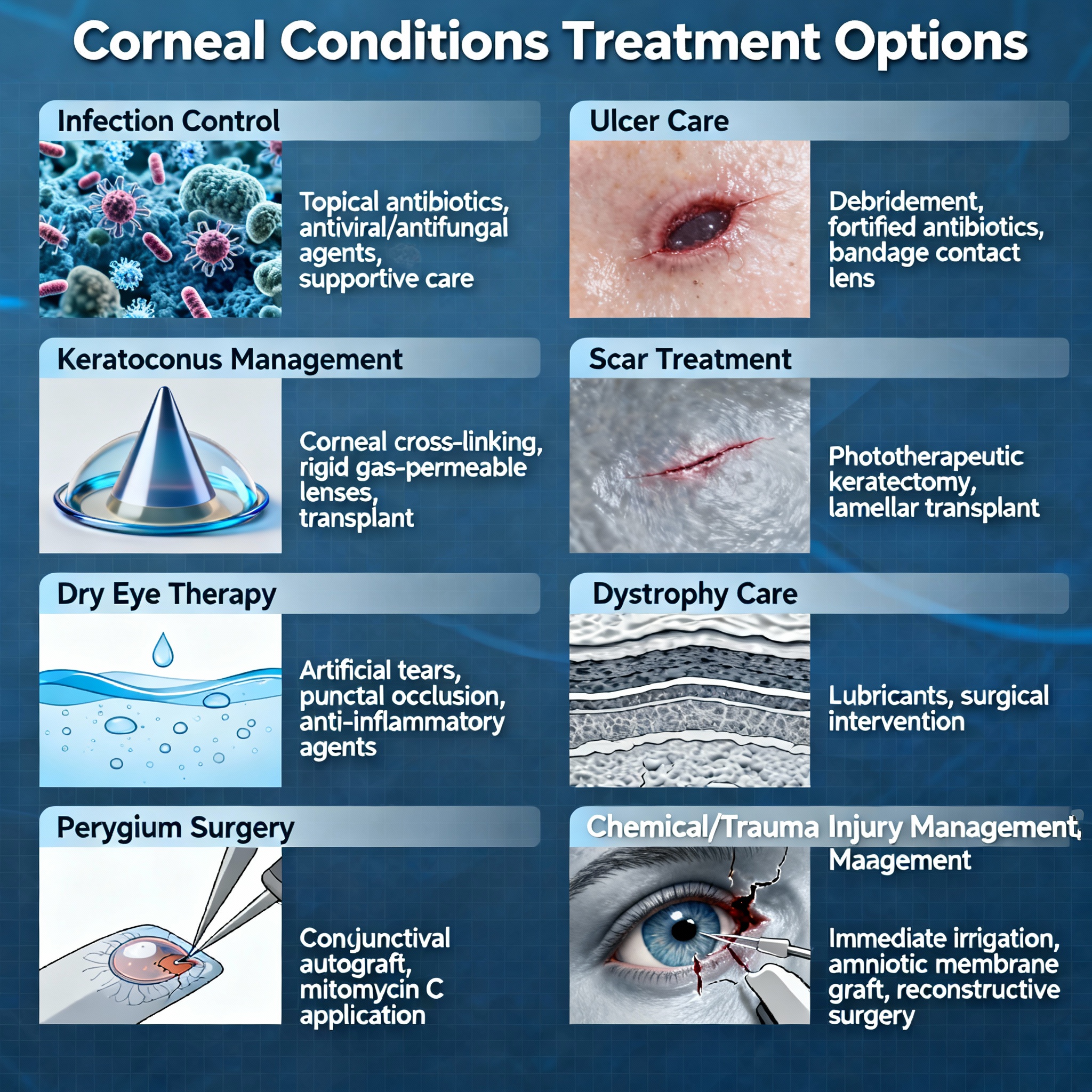 Chemical or Trauma Injuries: Immediate management of burns, physical injuries, or other acute corneal damage to prevent permanent vision loss.